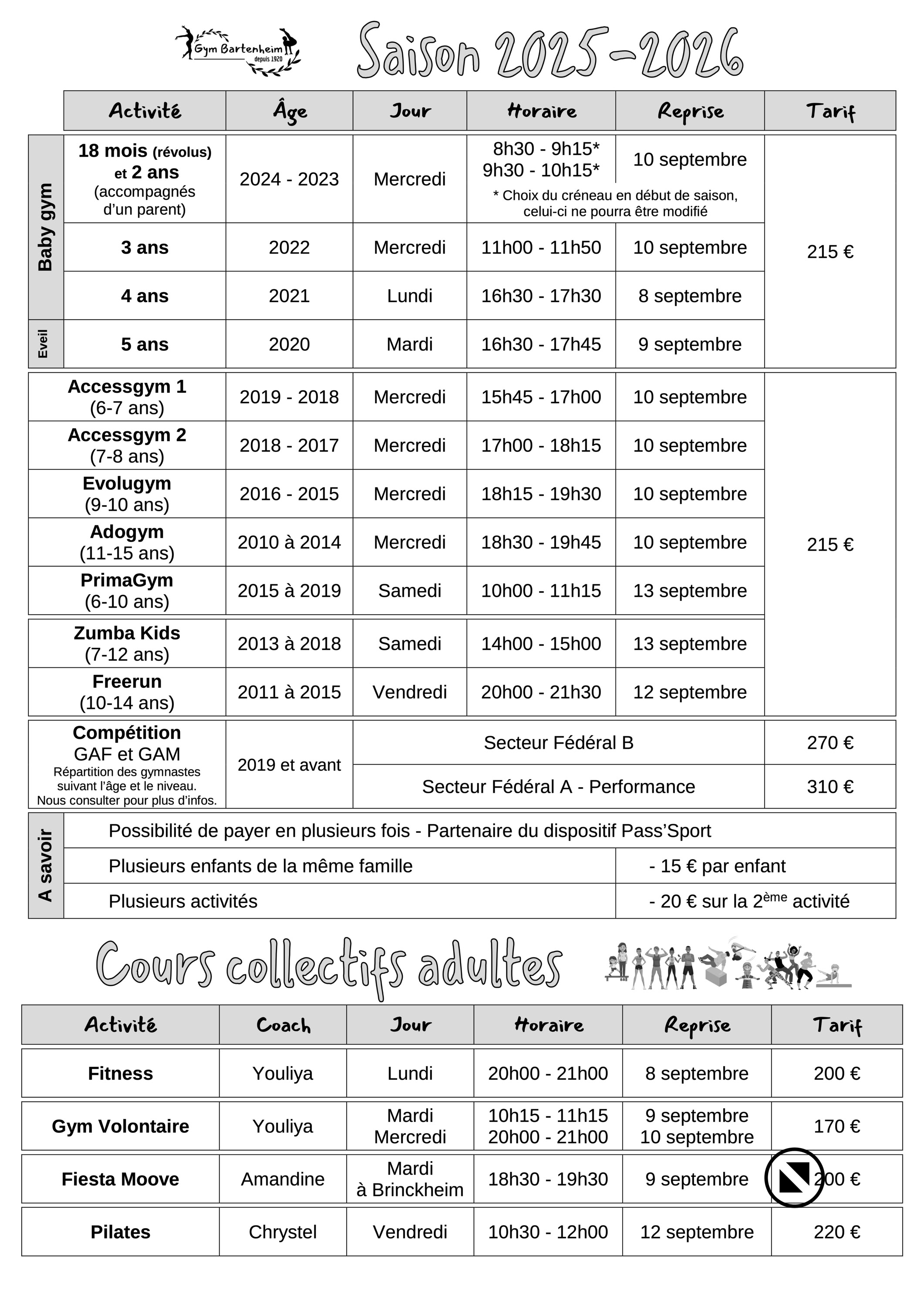 SAISON 2025 / 2026 - ACTIVITES, HORAIRES, TARIFS